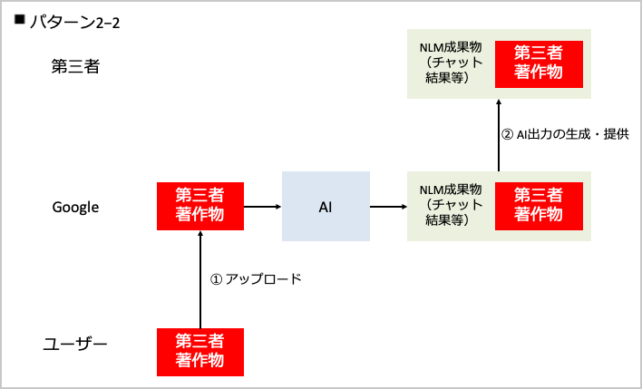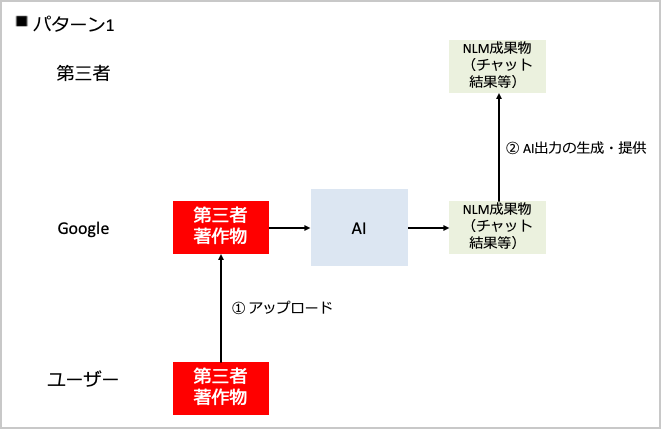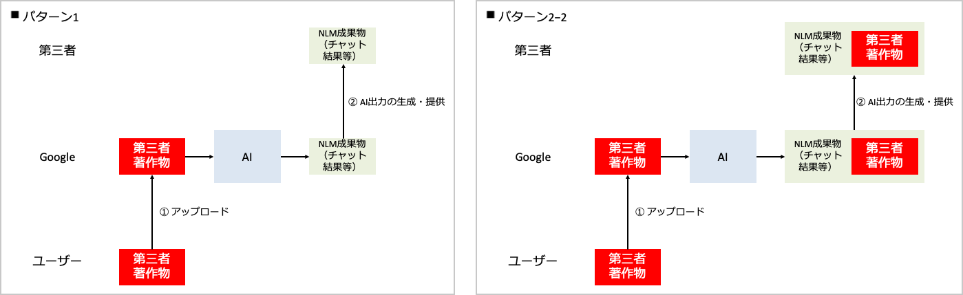これはNLMの利用の仕方(NLM成果物の内容)によって異なります。つまり、同じNLMの利用であっても、NLM成果物の内容次第でパターン1にもパターン2−2にもなりうるということです。